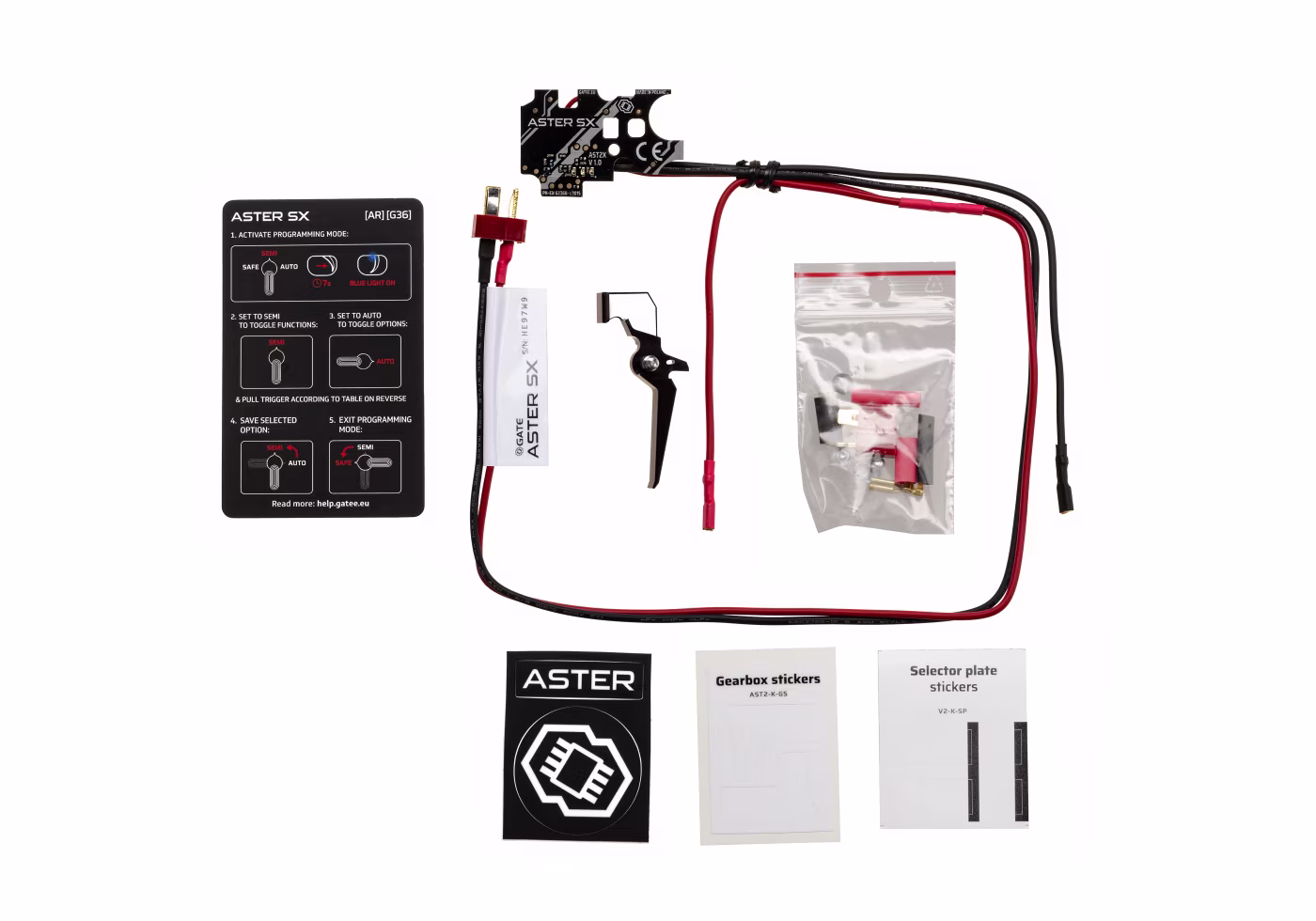 Der ASTER SX wird mit einem Quantum Trigger geliefert, mit dem sich die Abzugsempfindlichkeit von einer sehr leichten Berührung bis zum vollständigen Ziehen einfach einstellen lässt. Die verbesserte Programmierung über den Abzug ermöglicht präzise Einstellungen für Funktionen wie automatisches Vorspannen, Abzugsempfindlichkeit und aktiv Break mit einem erweiterten adaptiven Modus. Die Kalibrierung ist sowohl über den Abzug als auch über den Feuerwahlhebel möglich.