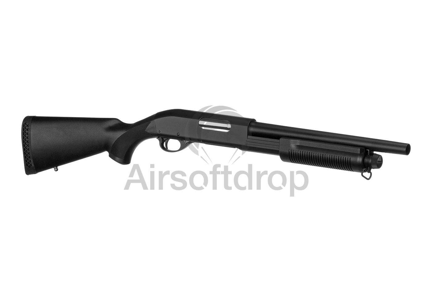 Die CM350M wiegt ca. 2300g und schießt in 3 Schuss aus drei internen Läufen mit einer typischen Pump-Action-Nachladebewegung. Der Schaft mit Gummipolster und schwarzem Vorderschaft ist in einer klassischen Version mit Befestigungspunkten für Riemen gefertigt.