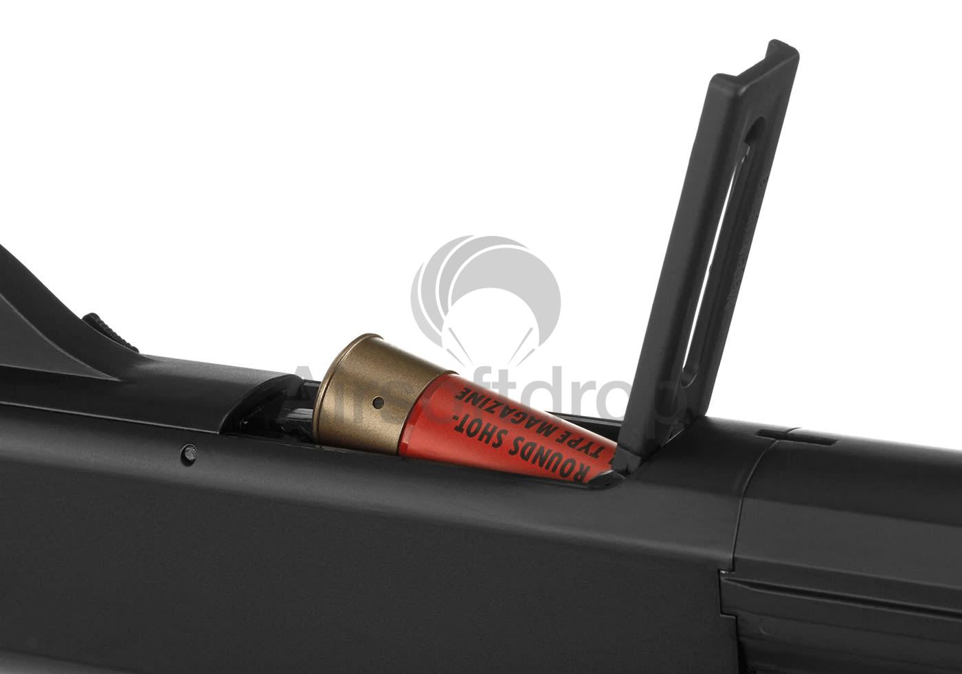 Die aus hochwertigem ABS-Polymer und Aluminium gefertigte, die Federdruckflinte wird von einem austauschbaren Magazin im Stil einer typischen Schrotflintenhülse mit einer Kapazität von 30 Schuss gespeist.