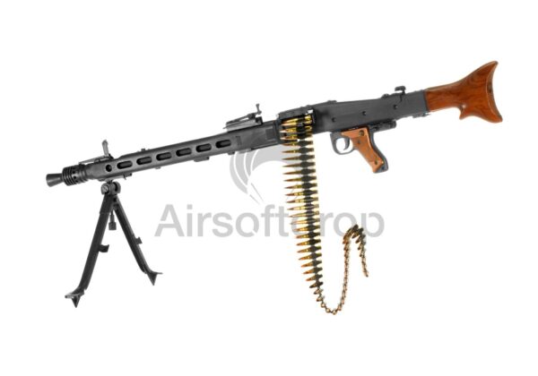 Die G&G GMG42 0,5J ist eine hochwertige Airsoft-Replik des historischen MG42, gefertigt aus Stahl und Holz, mit einer Mündungsenergie von ca. 0,5 Joule.