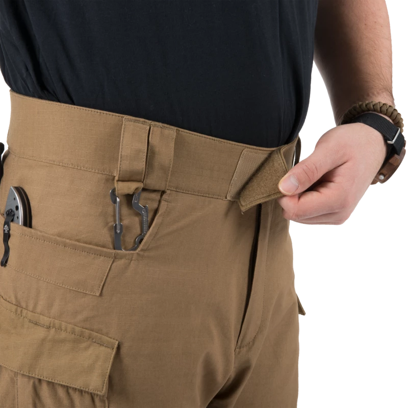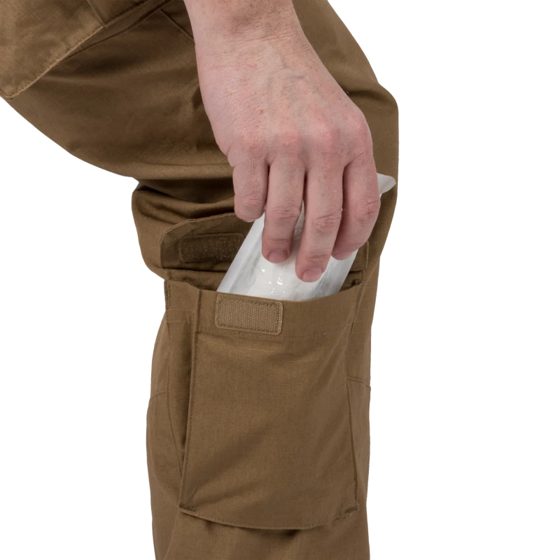 Die standardmäßigen Seitentaschen haben verstärkte Kanten, um Abnutzung durch das Tragen von Taschenmessern und anderen scharfkantigen Gegenständen zu reduzieren. Geräumige Cargo-Taschen an den Oberschenkeln eignen sich ideal für größere Ausrüstungsgegenstände. Kleinere Waden-/Unterschenkeltaschen sind praktisch für Kleinteile, die schnell griffbereit sein sollen.