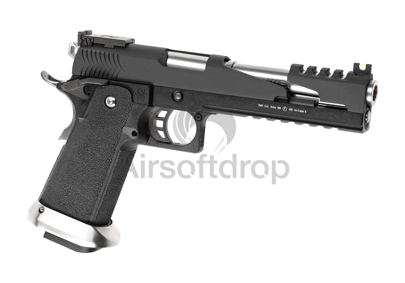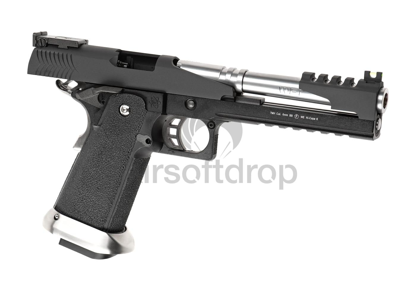 Die Hi-Capa 6 T-Rex Customs Titanium Barrel von WE ist ein halbautomatischer Nachbau einer der berühmtesten Pistolen der Welt aus Vollmetall. Sie wurde mit dem ausdrücklichen Ziel entwickelt, einige wesentliche Merkmale der 1911er Pistole zu verbessern. Sie wird mit Gas betrieben, wiegt 1,2 kg, ist 240 mm lang und hat eine Magazinkapazität von 27 Schuss. Das Hi-Capa 6 T-Rex Customs Titanium Barrel hat einen 130 mm langen Innenlauf und erzeugt eine Leistung von ca. 360 FPS. Auf der Oberseite befindet sich ein Fiberkorn und eine verstellbare Kimme - eine hervorragende Lösung zur Verbesserung der Visierlinie und Präzision. Die Einfräsungen an der Vorderseite des Schlittens ermöglichen eine schnellere Rückkehr zum Ziel nach jedem Schuss. Weitere wichtige Verbesserungen an diesem Nachbau sind die verbesserten Rillen am Schlitten, der beidseitige Sicherungshebel, die Griffsicherung, das Magazin mit hoher Kapazität und das Gewinde im Lauf. Die Handfeuerwaffe hat Schalen mit einer rutschfesten Riffelung auf der Grifffläche.