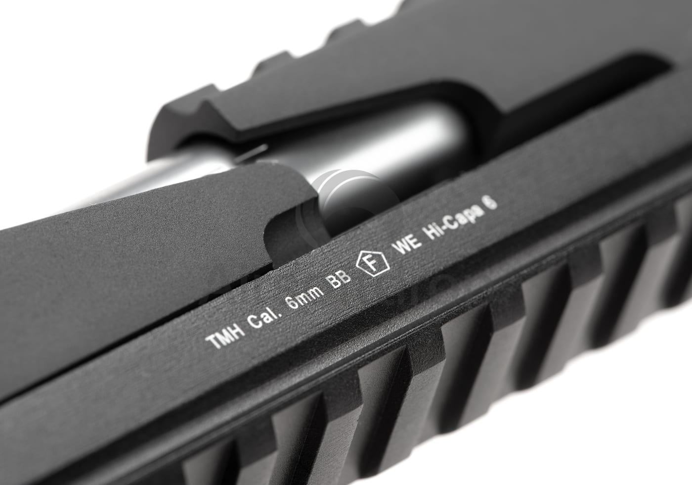 Außerdem ist sie mit einer Picatinny-Schiene für taktische Lampenmodule und Laserzielgeräte ausgestattet. Die robuste und hochwertige Konstruktion des Nachbaus besteht aus überwiegend metallischen Bauteilen (Rahmen und Schlitten). Die Griffschalen und andere Komponenten sind dagegen aus Polymeren gespritzt. Im Inneren hat WE hochwertige Teile verbaut, die eine lange Lebensdauer und Präzision bei jedem Schuss garantieren. Das Hi-Capa 6 T-Rex Customs Titanium Barrel verfügt über ein robustes GBB-System, das den Rückstoß und das Schlittenverhalten während des Schusses imitiert. Dadurch wird ein außergewöhnliches und realistisches Schießerlebnis wie mit einer echten Pistole erzielt. Darüber hinaus verfügt die Handfeuerwaffe über einen einstellbaren Hop-Up-Mechanismus, der die Genauigkeit und Stabilität der Waffe während des Schusses verbessert. Egal ob Sie ein erfahrener Airsoft-Profi oder ein Anfänger sind, dieses Replikat ist eine ausgezeichnete Wahl für alle, die eine zuverlässige Waffe suchen.