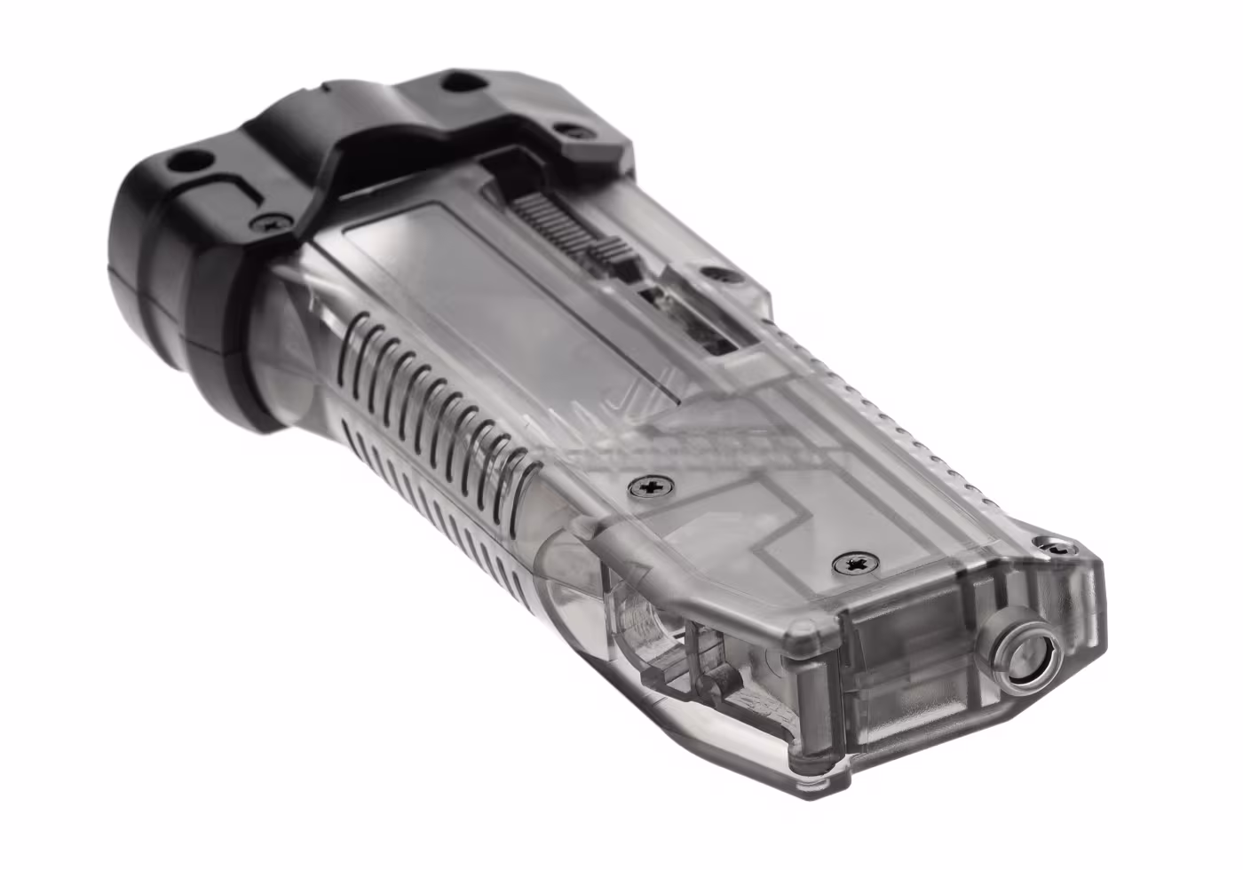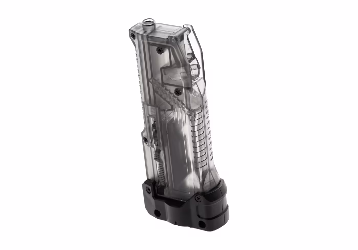 Die Flasche mit BBs wird auf den Loader geschraubt und über einen seitlich - ausklappbaren Hebel kann geladen werden