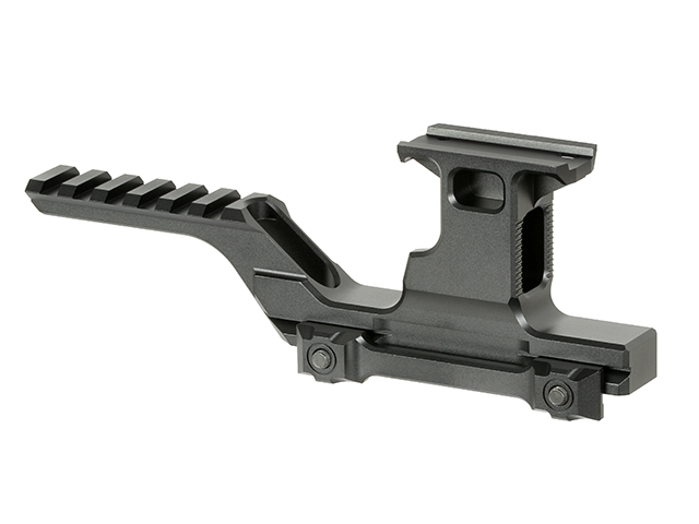 Diese Montage ermöglicht es dem Benutzer, den Griff nicht durch Ausrüstungseinschränkungen zu beeinträchtigen oder die Handposition aufgrund begrenzten Platzes auf der Schiene zu verändern. Durch die Anhebung von Zubehör wie Taschenlampen oder Lasern über die Picatinny-Schiene hinaus wird deren Position zum Rotpunktvisier optimiert. Diese Konfiguration beseitigt Hindernisse und verlagert das Gewicht des Zubehörs zur Mitte des Gewehrs, oberhalb des Magazinschachts. Dadurch wird die Gesamtbalance der Waffe verbessert, was Komfort und Ergonomie erhöht.