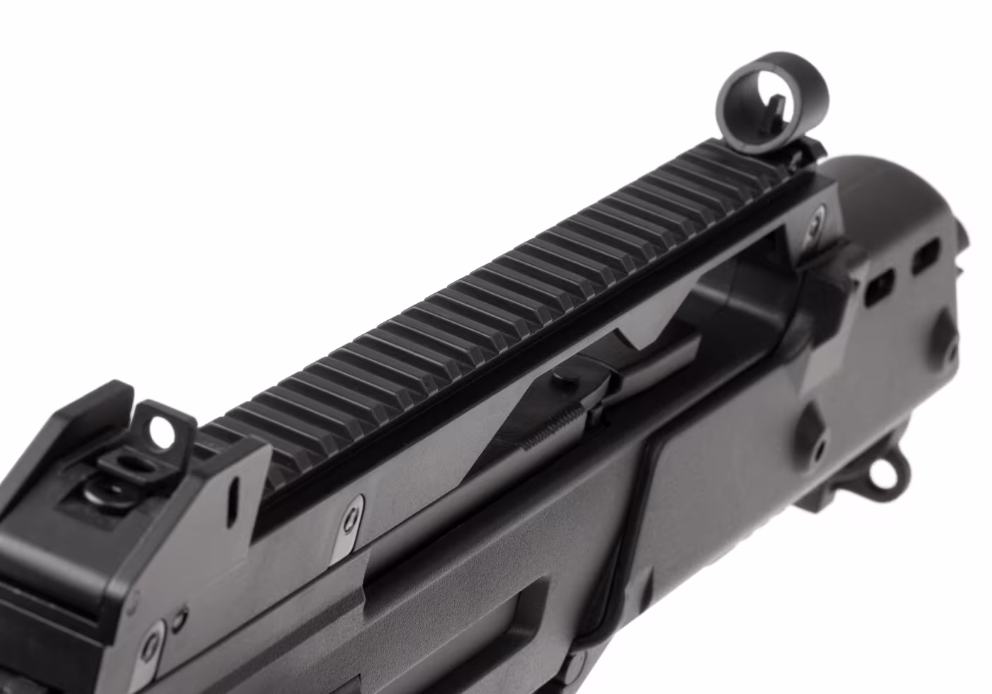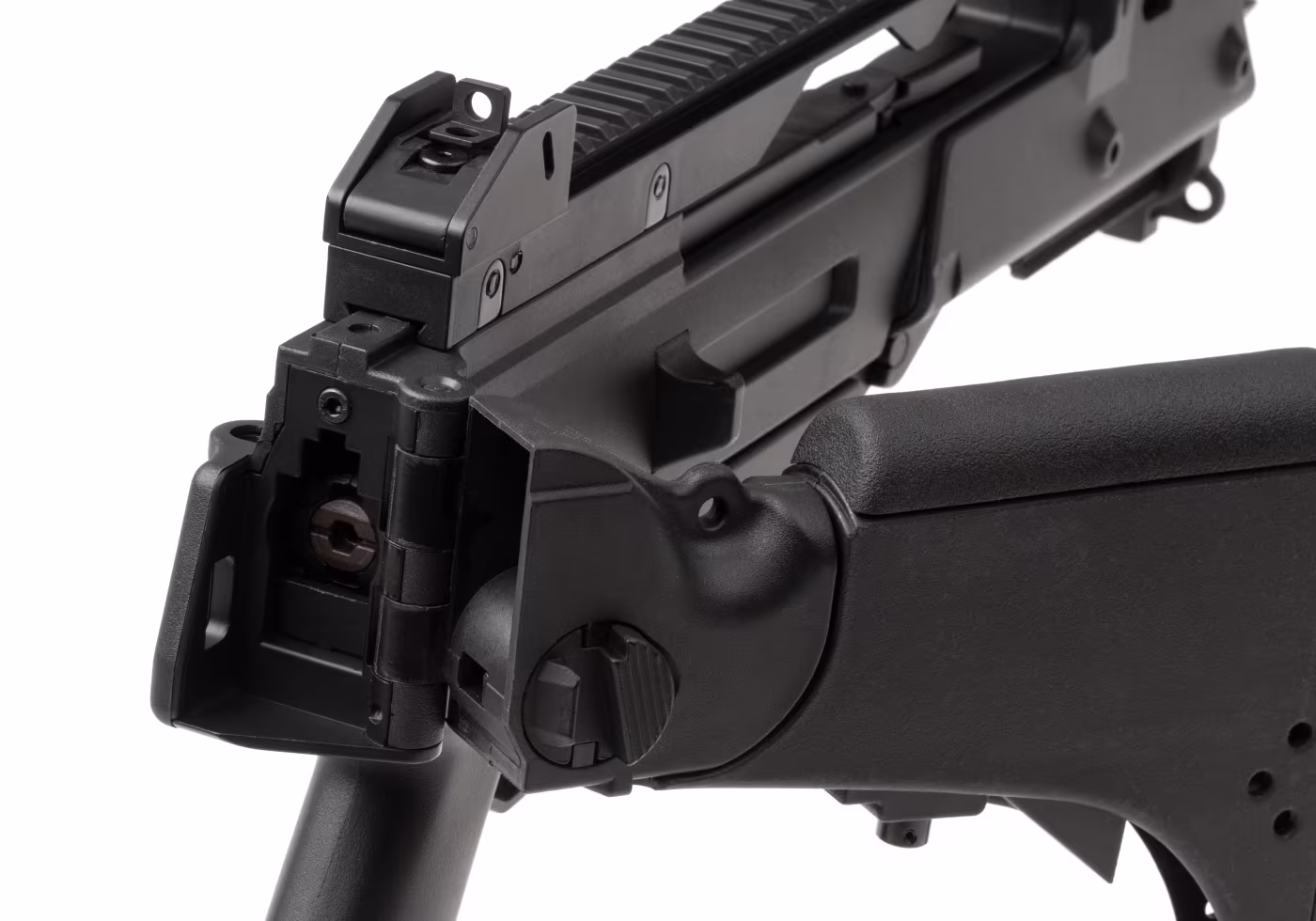 Dadurch kann der Benutzer je nach Vorliebe oder Einsatzerfordernissen verschiedene Zubehörteile anbringen. Der Lauf ist mit einem 14 mm CCW-Gewinde ausgestattet und kann mit einer Vielzahl unterschiedlicher Mündungsaufsätze bestückt werden. Der klappbare Schaft ist bequem zu handhaben und ermöglicht eine schnelle Zielerfassung.