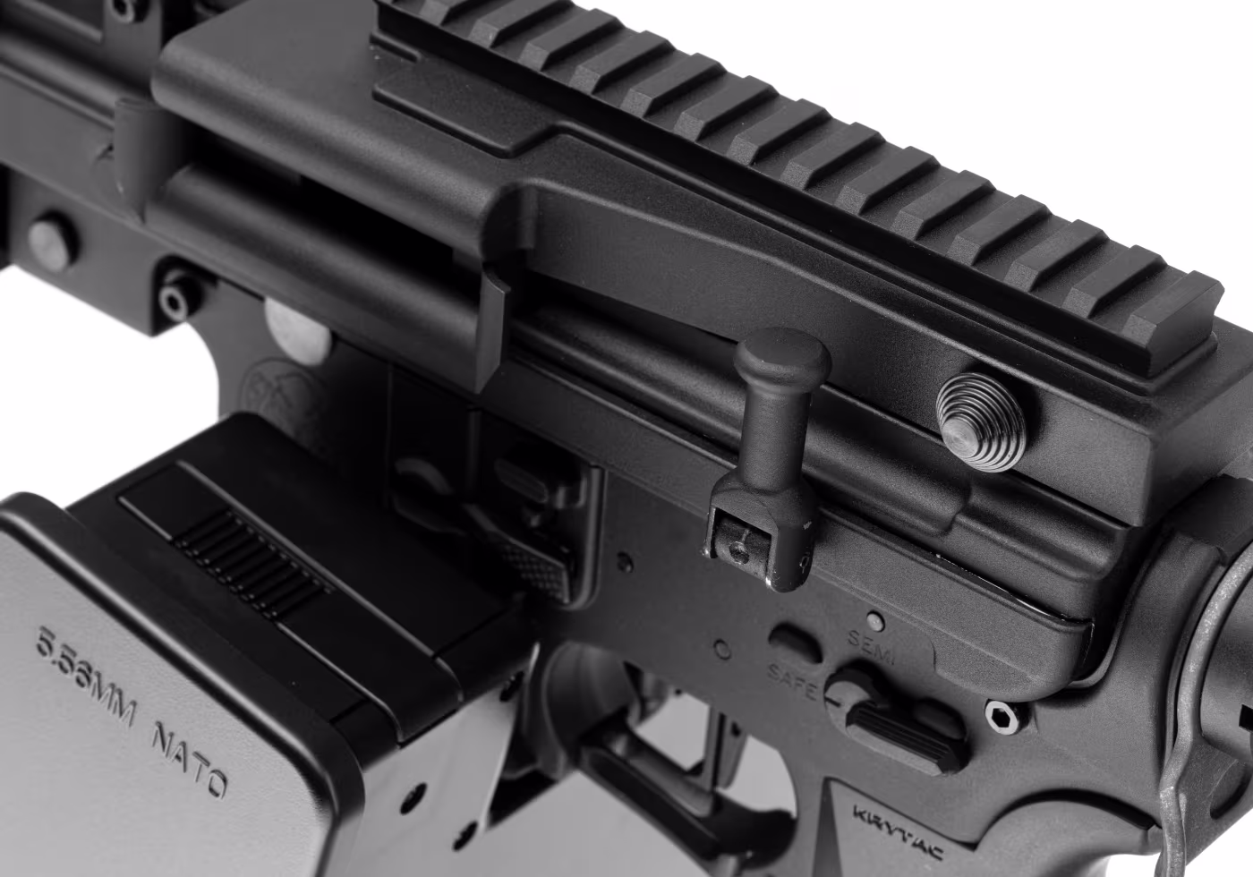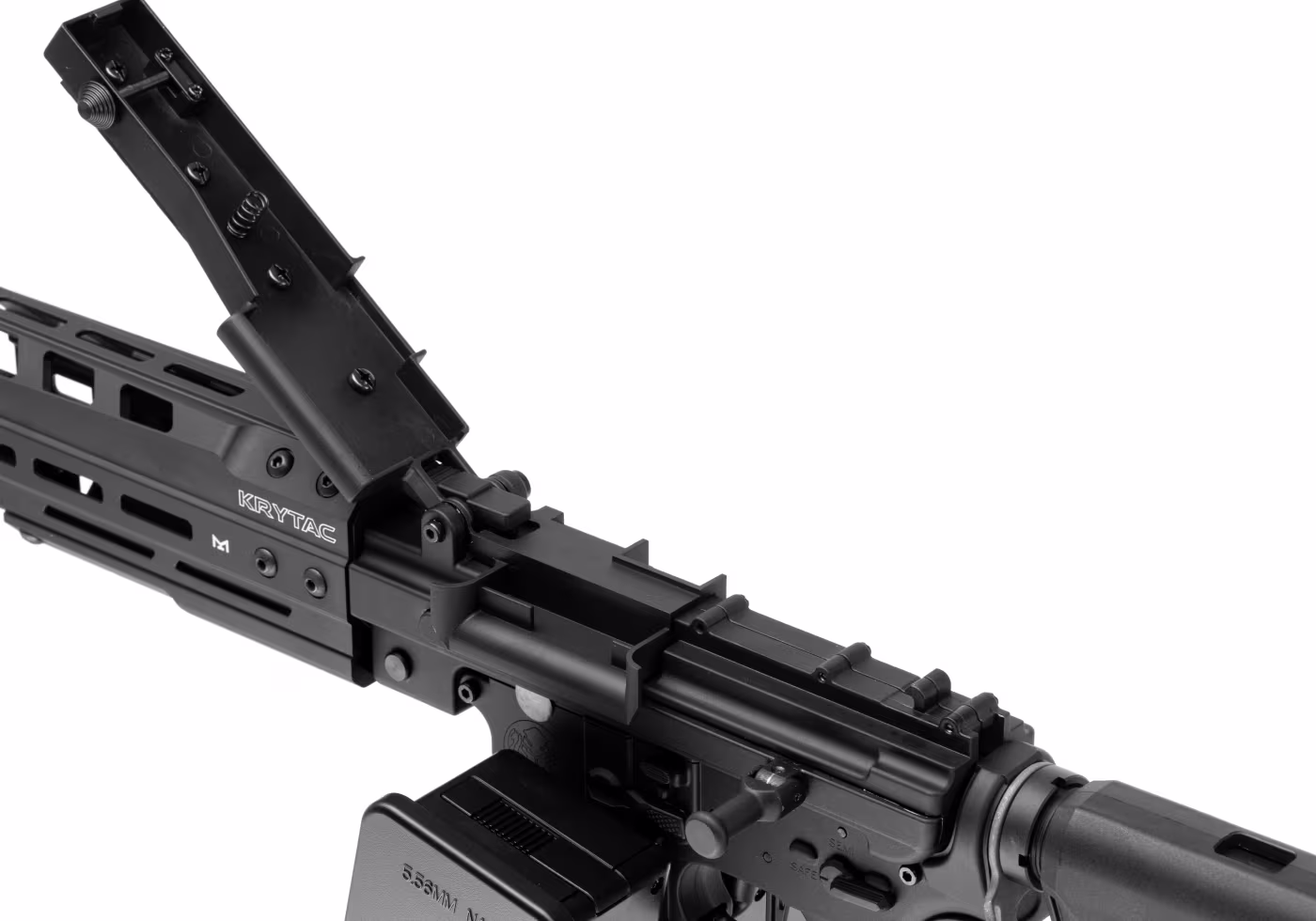 Das Obergehäuse ist das Hauptmerkmal, das den Unterschied ausmacht. Es ist dem MCR-Maschinengewehrgehäuse nachempfunden und verfügt über einen Ladehebel auf der linken Seite sowie eine klappbare, federbelastete Abdeckung mit einer einzelnen Picatinny-Schiene. Das modifizierte Obergehäuse ahmt Aussehen und Funktion eines echten, gurtgespeisten Pendants nach. Ein 228 mm langer Aluminium-Außenlauf beherbergt den 310 mm langen, hochpräzisen Innenlauf mit einem Durchmesser von 6,03 mm. Der Lauf endet mit einem Mündungsfeuerdämpfer im Vogelkäfig-Design, der über ein 14-mm-CCW-Gewinde befestigt ist. Der flache, einklappbare Schaft ist komfortabel und lässt sich leicht an die Statur und Vorlieben des Benutzers anpassen. Er verfügt über eine rutschfeste Gummiauflage und Schnellverschlüsse zur Befestigung von Tragegurten.