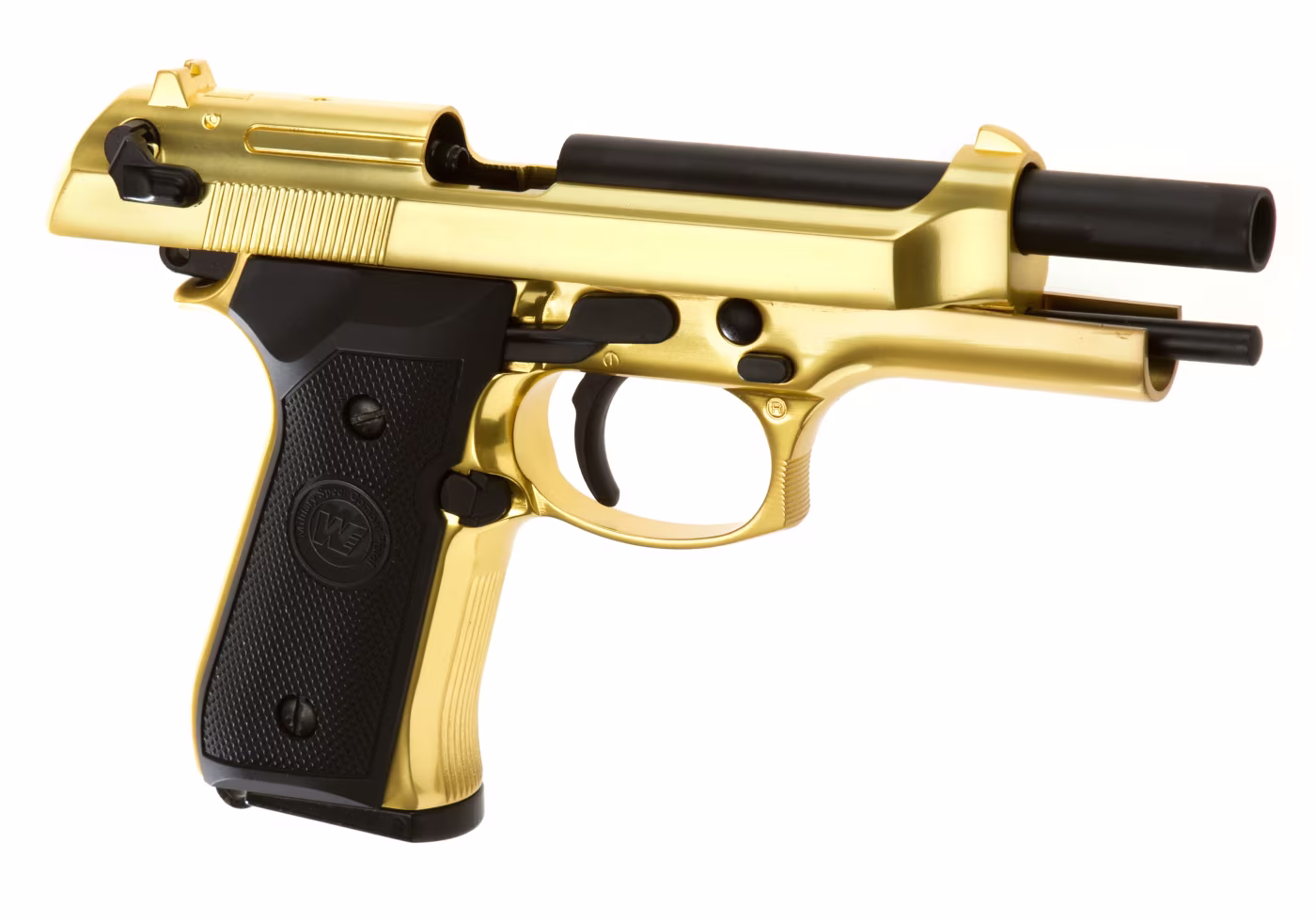 Die M9 von WE ist ein halbautomatischer Nachbau einer der bekanntesten Militär- und Behördenpistolen. Sie wird mit Gas betrieben, wiegt 1,1 kg, ist 215 mm lang und hat eine Magazinkapazität von 25 Schuss. Die M9 verwendet einen 108 mm langen Innenlauf und erreicht eine Leistung von ca. 330 FPS. Die Replik ist mit einer beidseitigen Sicherung ausgestattet, die für Linkshänder hilfreich sein kann. Außerdem verfügt sie über einen Entspannhebel und einen Double/Single-Action-Abzug. Die Handfeuerwaffe hat Griffschalen mit rutschfester, geriffelter Oberfläche. Die solide und hochwertige Konstruktion des Replikats besteht hauptsächlich aus Metallteilen (Rahmen und Schlitten).