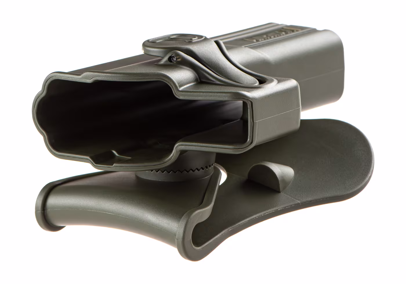 Schnell und Bequem: Mit dem Paddle-Design lässt sich das Holster mühelos und schnell an einem Gürtel oder einer Hosenbundkante befestigen und entfernen – ideal für einfaches Tragen und schnelles Ziehen der Waffe.