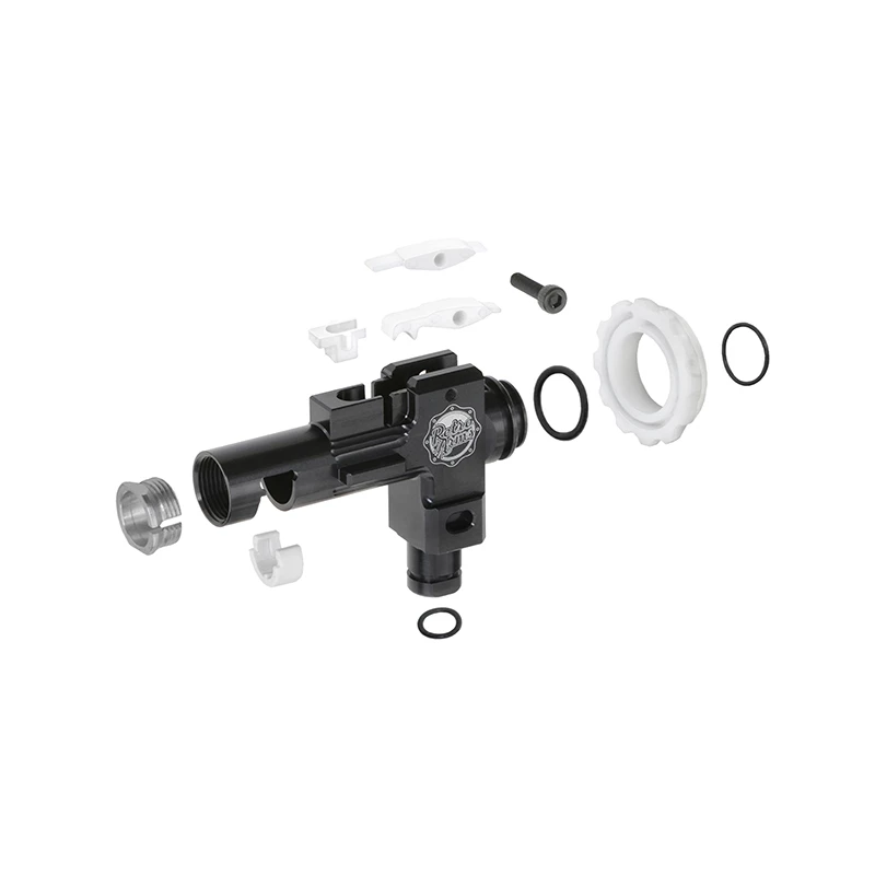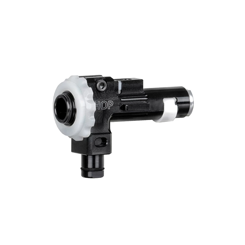 Die AR15 BASIC Hop-Up-Kammer ist eine Hochleistungseinheit des tschechischen Herstellers RetroArms, entwickelt für AEG-Repliken auf Basis der AR15/M4-Plattform. Das Gehäuse ist präzisionsgefertigt aus EN AW 7075 Aluminium. Der Kammereinlass verfügt über einen O-Ring, der das Herausfallen von BBs beim Nachladen verhindert. Die Spannmutter gewährleistet die Laufzentrierung und eliminiert unerwünschte Bewegungen unabhängig vom Außendurchmesser des Laufs (kompatibel mit 8,4–8,5 mm Läufen). Die BASIC-Version ist besonders einfach zu installieren, da weder die Düsenlänge noch die Getriebeausrichtung angepasst werden müssen. Sie ist zudem mit den meisten Hop-Up-Gummis vollständig kompatibel.